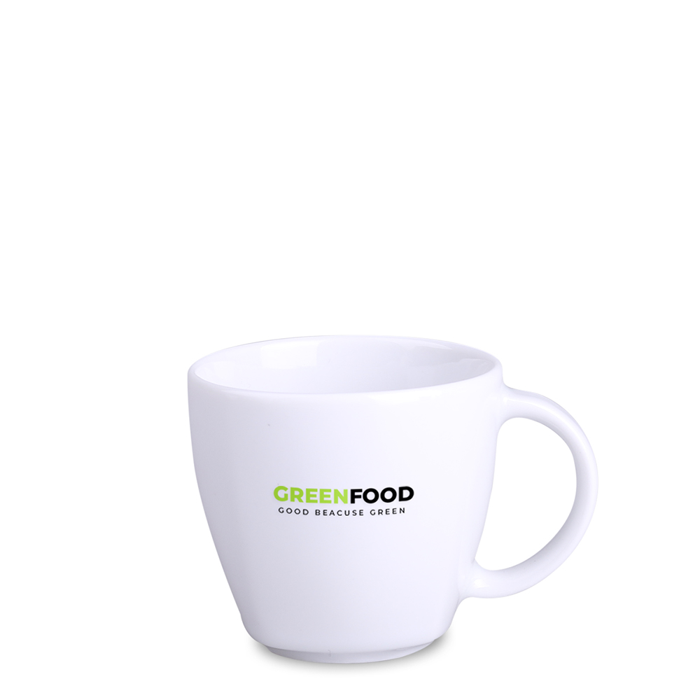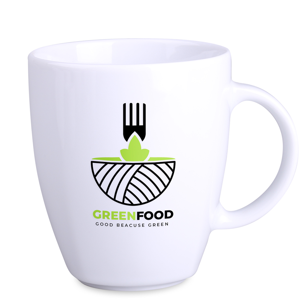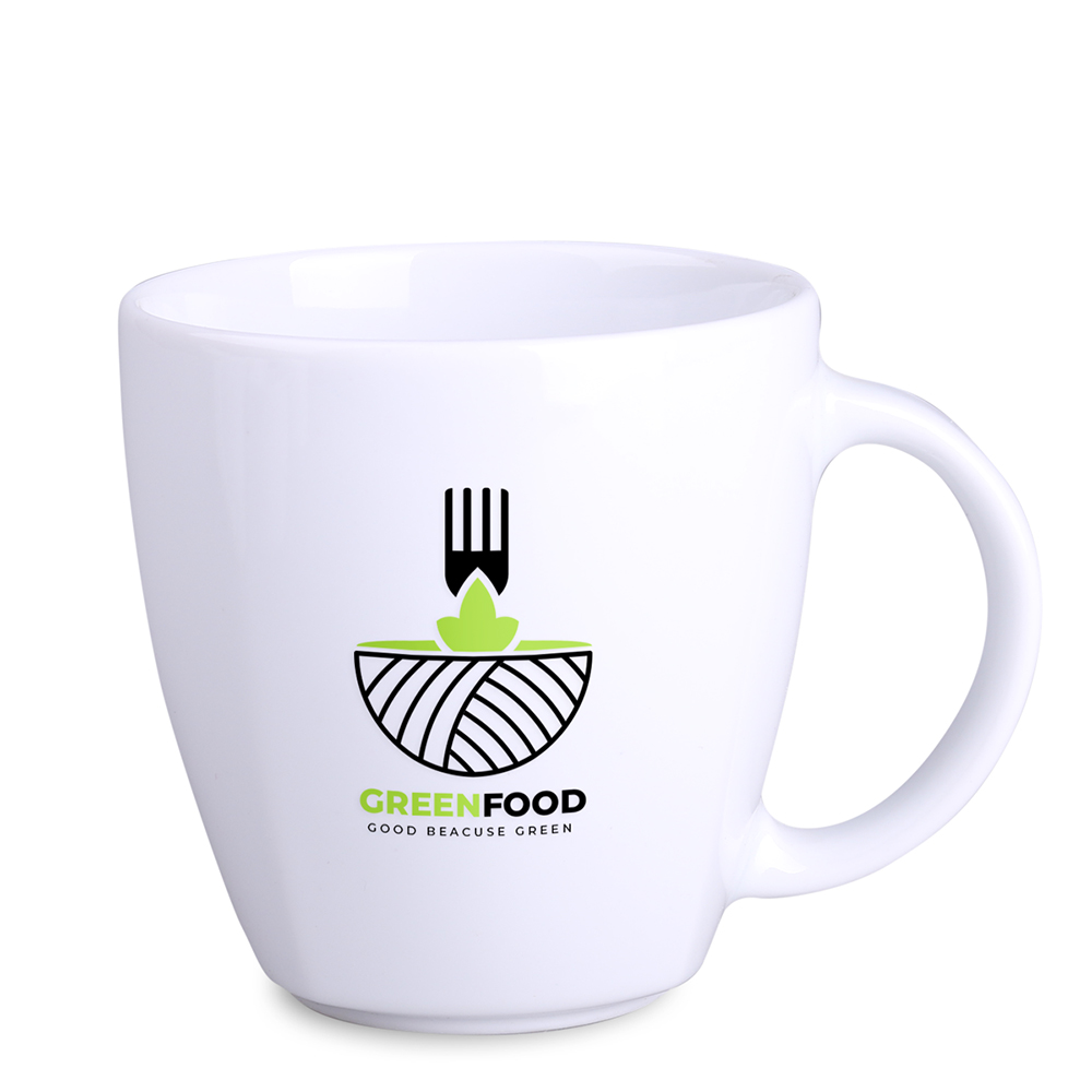 A porcelain advertising mug available in two sizes. This design features delicate edges visible in the lower part.